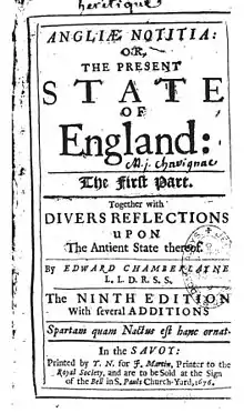 His best-known work is a handbook to the social and political condition of England, with lists of public officers and statistics, entitled Angliæ Notitia, or The Present State of England; the publication was an adaptation of L'Estat Nouveau de la France (Paris, 1661). The first edition appeared anonymously in 1669, and was dedicated to the Earl of Carlisle. Two other editions, with the author's name, were issued later in the same year. With the fifth edition of 1671 is bound up the first edition of a second part, containing additional information; in the seventh edition of 1673 a portrait of Charles II, by William Faithorne, makes its first appearance; in the ninth edition of 1676 is a new dedication to the Earl of Danby;[2] with the eighteenth edition of 1694 is bound up a new third part, first issued separately in 1683. Thomas Hearne states that Andrew Allam made major contributions, to the sixteenth edition (1689), and that his information was inserted by Chamberlayne without acknowledgment. Chamberlayne issued the twentieth edition in 1702, and after his death his son John continued to edit the publication. The twenty-first edition (1708) bears the new title Magnæ Britanniæ Notitia, or the Present State of Great Britain. John Chamberlayne died after the issue of the twenty-second edition in 1723, but fourteen editions were subsequently issued by the booksellers, the last being the thirty-sixth and bearing the date 1755.[1]