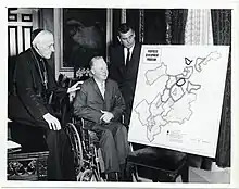 Logue (far right) presents plans for the redevelopment of Boston to mayor John F. Collins (center) and Cardinal Richard Cushing (far left)