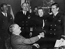 Credited with shooting down five bombers, O'Hare became a flying ace, was selected for promotion to lieutenant commander, and became the first naval aviator to receive the Medal of Honor. With President Franklin D. Roosevelt looking on, O'Hare's wife Rita placed the Medal around his neck. After receiving the Medal of Honor, then-Lieutenant O'Hare was described as "modest, inarticulate, humorous, terribly nice and more than a little embarrassed by the whole thing".[24]