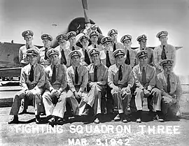 When Butch finished his naval aviation training on May 2, 1940,[5] he was assigned to Fighter Squadron Three (VF-3) on board USS Saratoga. O'Hare then trained on the Grumman F3F and then graduated to the Brewster F2A Buffalo. Lieutenant John Thach, then executive officer of VF-3, discovered O'Hare's exceptional flying abilities and closely mentored the promising young pilot.[6] Thach, who would later develop the Thach Weave aerial combat tactic, emphasized gunnery in his training. In 1941, more than half of all VF-3 pilots, including O'Hare, earned the "E" for gunnery excellence.