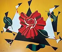 As the Second World War started Wadsworth was disappointed not to be appointed as a war artist by the War Artist's Advisory Committee and Wadsworth and his wife, daughter and her two sons had to leave Dairy House as it was in an area cleared of civilians by the army. The Wadsworths moved to Buxton in Derbyshire - where they stayed for five years. Concern about the war and Wadsworth's own circumstances seem to inform the melancholic mood created in the debris-strewn beach of Requiescat.[37]For the first time Wadsworth's finances were under pressure and this may have contributed to his decision to start exhibiting at the Royal Academy summer show. In April 1943 he was elected an ARA - Associateof the Royal Academy. Wadsworth had joined the Buxton Home Guard and after training he was promoted to Sergeant. The family moved back to Maresfield in 1945 and Wadsworth painted a series of abstract images that incorporated flower imagery. Although very different to his Vorticist abstracts of 1914, his last paintings, such as Triangles in 1948, did represent a return to, or development of, pure abstract forms.