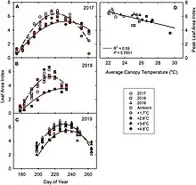 The CO2 fertilization effect or carbon fertilization effect causes an increased rate of photosynthesis while limiting leaf transpiration in plants. Both processes result from increased levels of atmospheric carbon dioxide (CO2).[66][67] The carbon fertilization effect varies depending on plant species, air and soil temperature, and availability of water and nutrients.[68][69] Net primary productivity (NPP) might positively respond to the carbon fertilization effect.[70] Although, evidence shows that enhanced rates of photosynthesis in plants due to CO2 fertilization do not directly enhance all plant growth, and thus carbon storage.[68] The carbon fertilization effect has been reported to be the cause of 44% of gross primary productivity (GPP) increase since the 2000s.[65] Earth System Models, Land System Models and Dynamic Global Vegetation Models are used to investigate and interpret vegetation trends related to increasing levels of atmospheric CO2.[68][71] However, the ecosystem processes associated with the CO2 fertilization effect remain uncertain and therefore are challenging to model.[72][73]