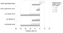 The US National Research Council assessed the literature on the effects of climate change on crop yields in 2011,[31] and provided central estimates for key crops.[31]:160 A meta-analysis in 2014 revealed consensus that yield is expected to decrease in the second half of the century, and with greater effect in tropical than temperate regions.[139]