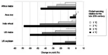Changes in temperature and weather patterns will alter areas suitable for farming.[33] The current prediction is that temperatures will increase and precipitation will decrease in arid and semi-arid regions (Middle East, Africa, Australia, Southwest United States, and Southern Europe).[33][34] In addition, crop yields in tropical regions will be negatively affected by the projected moderate increase in temperature (1-2 °C) expected to occur during the first half of the century.[24] During the second half of the century, further warming is projected to decrease crop yields in all regions including Canada and the Northern United States.[34] Many staple crops are extremely sensitive to heat and when temperatures rise over 36 °C (97 °F), soybean seedlings are killed and corn pollen loses its vitality.[35][36]