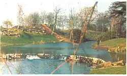 A view of the Tournament Bridge at its 'new' site. The level of the weir was lower at this time and was raised at a later date using randomly chosen stones to raise the water level.[17]