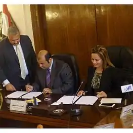 Khaled Hanafi, Egypt's Supply Minister and Iman Mutlaq(CEO of the Jordan-based Sigma Investments) on behalf of the consortium signs cooperation protocol to establish first ever electronic Egyptian Commodities Exchange in Egypt in November 2015.