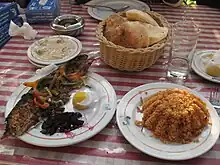 | Sayadiya | صيادية | A coastal dish. Rice with onion cooked in tomato paste, usually served with fried fish.[31] |
