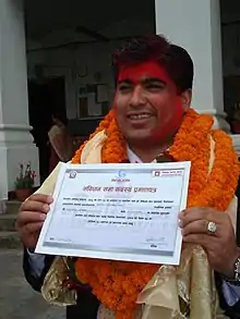 Dhakal was re-elected in the 2013 Nepalese Constituent Assembly election for a four-year term.[25] Dhakal serves in the most powerful parliamentary committee Public Accounts Committee.[26] Dhakal serves as Global Vice President of Sun Moon University based in Korea.[27] Dhakal also a Member of the Parliamentarians for Global Action based in United States of America.[28] Dhakal advocates Universality and said at one of the religious function organized in his district Gorkha that representatives do not belong to a particular religion and ethnicity instead they represent the whole country and goodness of all faiths.[29] Ek Nath Dhakal founded Parliamentary Peace Council (PPC Nepal) for building a culture of peace based on rule of law, democracy, service and universally shared values on November 6, 2014. The inaugural assembly was presided by Speaker of the Legislature Parliament of Nepal Subash Chandra Nembang and lawmakers from Nepal and India were in attendance.[30] Peace advocate Dhakal is active in promoting multidimensional peace in South Asia.[31]