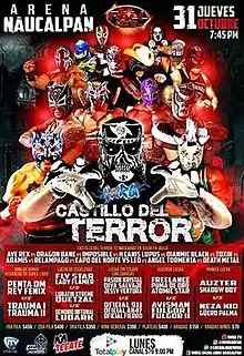 Starting as far back as at least 2002, the Mexican wrestling promotion International Wrestling Revolution Group (IWRG; Sometimes referred to as Grupo Internacional Revolución in Spanish) has held several annual events where the main event was a multi-man steel cage match where the last wrestler left in the cage would be forced to either remove their wrestling mask or have their hair shaved off under Lucha de Apuestas, or "bet match", rules. From 2005 IWRG has promoted a fall show, around the Mexican Day of the Death, under the name El Castillo del Terror ("The Tower of Terror"),[2] to distinguish it from other Steel cage matches held throughout the year such as the IWRG Guerra del Golfo ("Gulf War"),[3] IWRG Guerra de Sexos ("War of the Sexes"),[4] or IWRG Prisión Fatal ("Deadly Prison") shows.[5] The Castillo del Terror shows, as well as the majority of the IWRG shows in general, are held in "Arena Naucalpan", owned by the promoters of IWRG and their main arena. The 2019 Castillo del Terror show will be the 15th year in a row that IWRG has promoted a show under that name.