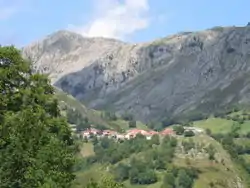 The village sits at the western end of a 2.5 km closed valley drained by the Río Belugas and the Río del Pasador, which join just before sinking into Cueva del Bolugo[3] (43°22′45″N 4°51′03″W); the river passes nearly directly under the village to resurge at Caldueñin (43°22′48″N 4°51′54″W).