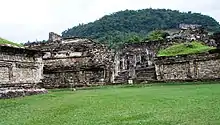 The site is located in Mexico in the highlands of the municipality of Papantla in modern-day Veracruz, not far from the city of Poza Rica, which lies northwest of the port and city of Veracruz. The city is set in the low rolling mountains that lead from the Sierra Madre Oriental to the Gulf coast near the Tecolutla River.[11] In ancient times, this city was located in the northeast corner of what is called Mesoamerica,[12] and controlled an area from between the Cazones and Tecolutla Rivers to the modern state of Puebla.[13] The main city is defined by two streams which merge to form the Tlahuanapa Arroyo, a tributary of the Tecolutla River.[12] These two streams provided the population's potable water. Most of the buildings are at the southern end, where the land is relatively flat and the two streams converge. The site extends to the northwest where terraces were constructed to place more buildings, mostly for the city's elite. However the city also had communities located on the hills east and west of the main city, with mostly lower-class dwellings.[11] Total site extends for 1,056 hectares (4.08 sq mi).[14]