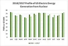 Actual USA electricity generation[15] in 2020 was 4007.14 terawatt-hours (TWh) and was down 120.72 TWh (2.9%) from 2019. The USA also imported 61.44 TWh and exported 14.14 TWh:[16] making a total of 4054.45 TWh for consumption, down 112.45 TWh (2.7%) from 2019.In 2020, for the first time, electric energy from Nuclear exceeded electric energy from Coal.