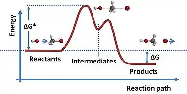 Atoms in molecules or solids are held together by chemical bonding, which stabilizes the molecule or solid (i.e. reduces its energy). When molecules or solids of relatively high energy are brought together, a spontaneous chemical reaction can occur that rearranges the bonding and reduces the (free) energy of the system.[37] In batteries, coupled half-reactions, often involving metals and their ions, occur in tandem, with a gain of electrons (termed "reduction") by one conductive electrode and loss of electrons (termed "oxidation") by another (reduction-oxidation or redox reactions). The spontaneous overall reaction can only occur if electrons move through an external wire between the electrodes. The electrical energy given off is the free energy lost by the chemical reaction system.