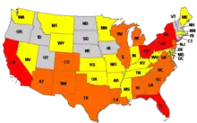 The Uniformed and Overseas Citizens Absentee Voting Act (UOCAVA) lets overseas citizens and all military and merchant marine voters get ballots electronically (email, fax, or web site). They then submit ballots by mail to 19 states. Seven states allow submission through secure web sites: AL, AZ, CO (if needed), MA, MI,[88] NC, ND, and WV. These seven and the remaining 25 states have a mix of rules allowing email or fax:[87] AK, CA, DE, DC, FL, HI, IN, IA, KS, LA, ME, MS, MO, MT, NE, NV, NJ, NM, OK, OR, RI, SC, TX (for danger, combat zones or space[89][90]), UT, and WA.[87] The Federal Voting Assistance Program converts emails to fax at voter request, so states which require fax receive ballots which started as emails.[91]