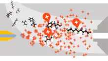 The liquid containing the analytes of interest is dispersed by electrospray,[16] into a fine aerosol. Because the ion formation involves extensive solvent evaporation (also termed desolvation), the typical solvents for electrospray ionization are prepared by mixing water with volatile organic compounds (e.g. methanol[17] acetonitrile). To decrease the initial droplet size, compounds that increase the conductivity (e.g. acetic acid) are customarily added to the solution. These species also act to provide a source of protons to facilitate the ionization process. Large-flow electrosprays can benefit from nebulization of a heated inert gas such as nitrogen or carbon dioxide in addition to the high temperature of the ESI source.[18] The aerosol is sampled into the first vacuum stage of a mass spectrometer through a capillary carrying a potential difference of approximately 3000 V, which can be heated to aid further solvent evaporation from the charged droplets. The solvent evaporates from a charged droplet until it becomes unstable upon reaching its Rayleigh limit. At this point, the droplet deforms as the electrostatic repulsion of like charges, in an ever-decreasing droplet size, becomes more powerful than the surface tension holding the droplet together.[19] At this point the droplet undergoes Coulomb fission, whereby the original droplet 'explodes' creating many smaller, more stable droplets. The new droplets undergo desolvation and subsequently further Coulomb fissions. During the fission, the droplet loses a small percentage of its mass (1.0–2.3%) along with a relatively large percentage of its charge (10–18%).[20][21]