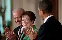 ![]() Kagan with President Obama and then-Vice President Joe Biden at the announcement of the nomination in the East Room of the White House | |