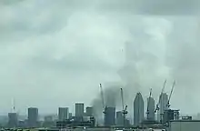 - @LondonFire (28 June 2021). "Three commercial units underneath the railway arches are completely alight and four cars and a telephone box are also alight near #ElephantandCastle Railway Station. Road closures are in place and people are advised to avoid the area and keep windows and doors closed" (Tweet) – via Twitter.