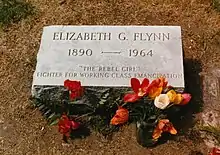 New Hampshire historical marker no. 278 honored Flynn in her hometown of Concord.[35] The unveiling of the marker in May 2023 led to controversy, with Governor Chris Sununu calling for a review of the process that led to its installation.[36] Within two weeks of being unveiled, the marker was removed.[37] A subsequent statement from CPUSA criticized the removal, stating, "If [her] life is important enough to hide, then her life is important enough to know."[38]