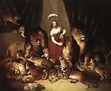 Wombwell was invited to the royal court on five occasions to exhibit his animals, three times before Queen Victoria. In 1847 the Queen Victoria noted the bravery of the "British Lion Queen" who appeared with lions, leopards and tigers.[2] She was given a personal audience with the Queen and was given a gold watch and chain. The following year she met George Sanger again; they had met when they were children, as their fathers had similar businesses. They corresponded and Sanger noticed that her boss was not keen on the romance. He estimated that Wombwells may have made £100 a day from her shows.[4]