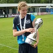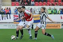 In July 2010, White returned to Arsenal after five years away, following the break up of the Leeds squad due to a funding crisis.[18] During her time at Arsenal with manager Laura Harvey, they won three league titles and two FA Cups.[19] During the 2011 season, she scored six goals in thirteen appearances for the club.[20] Her first goal was a game-opener in the 40th minute of a 2–1 loss to Birmingham City.[20] Arsenal finished first in the league with a 10–2–2 record.[21] White's six goals ranked fourth highest in the league and second highest on the team.[21] The same year, she helped the club win the 2011 FA WSL Cup and 2010–11 FA Women's Cup.[20] During the semi-final of the 2010–11 FA Women's Cup, she scored a hat-trick lifting Arsenal to a 5–0 win over Barnet F.C. and berth to the final where they defeated Bristol Academy 2–0.[22][23]