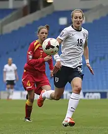 Just months after returning from an anterior cruciate ligament injury, White was called up for pre-World Cup friendlies in April 2015.[30] White also made the final squad for England's 2015 Women's World Cup team,[53] after scoring three in qualification, netting two in an 8–0 win over Turkey[54] and another in a 6–0 win over Belarus.[55] White failed to score in the finals, however, which saw England finish third—their best world cup performance.[56]