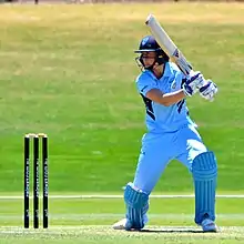 In the absence of Meg Lanning, Perry captained Victoria for their opening two matches of the 2021–22 season.[127] During the second match, played at the Junction Oval on 19 December, she recorded her first century for the team, scoring 120 from 94 balls despite a 27-run loss (via the DLS method) to New South Wales.[128]