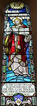 Elsie Mackay is commemorated by a stained glass window in the chancel of Glenapp Church in the parish of Ballantrae, Ayrshire (where her father owned the Glenapp estate).[17] Rhododendrons, now somewhat overgrown, spell out "Elsie" on the opposite side of the glen.(55.0288°N 5.014°W)[9] A street is named after her in Gander, Newfoundland and Labrador.[18] Her financial legacy was the Elsie Mackay Fund, a £500,000 trust bequeathed by her father that was left to the British nation on 12 December 1928, for 50 years and used to help pay off the national debt.[9][19][20]