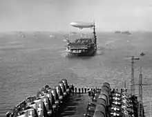 After World War II (1939–1945), military naval aviation enjoyed great prestige.[1] Naval aviation acts for the benefit of a naval force or in subsidiary activities of a navy. It can exist as land-based aircraft but operating at sea; rotary wing aircraft operating from ships such as cruisers; or fixed or rotary wing aircraft operating specifically from aircraft carriers.[2] In World War II, aircraft carriers replaced battleships as the backbone of large naval forces. In the Battle of the Atlantic, both carrier and land-based aviation were decisive instruments in anti-submarine warfare.[3] Although naval aviation can be defined as organic (maintained, piloted and commanded) of navies,[2] aircraft carriers created the belonging problem of embarked aviation between navies and air forces.[4]