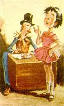A rag doll with a rough, antagonistic personality and an independent, anarchist behaviour, Emília is Lobato's most popular creation alongside Jeca Tatu. According to studies and analyses of Lobato's work, she is his personification in the stories and, through the character, he expressed his own ideas.[2] Even though Lobato has stated that Emília is "sometimes so independent that neither I, nor her father, succeed in controlling her". Since 1951, Emília has been adapted to stage plays, theatrical films and television series, being portrayed by several actresses (eleven altogether) since its creation.[3]