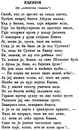 "Emina" (Cyrillic: Емина) is a poem by Bosnian Serb poet Aleksa Šantić that became a popular sevdalinka song, covered by many prominent singers from Bosnia and Herzegovina and other parts of former Yugoslavia. It was first published in 1902 in the Serbian literary journal Kolo.[1] The subject of the poem is Šantić's neighbor, a Bosnian Muslim[2] girl named Emina Sefić. It is one of the most well-known sevdalinka songs of all time.