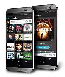 The NextRadio smartphone app was developed by Emmis, with support from the National Association of Broadcasters, to enable FM radio reception on mobile devices with activated internal FM receivers.[46] NextRadio allows users of many FM-enabled smartphones to listen to broadcast FM radio—with no need for Internet connection or use of phone data—and receive supplemental data such as album art, program information, and metadata over the Internet if connected.[47][48] Launched in August 2013 through a radio industry agreement with Sprint Corporation,[49] the app was preloaded on some devices, and available for download in the Google Play Store of Android applications.[50]