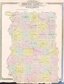 The county was created by the Dakota Territory legislature on February 10, 1879, with territories partitioned from Burleigh and Campbell counties. It was not organized at the time, but it was not attached to another county for administrative and judicial purposes. This continued until November 9, 1883, when the governing structure was organized. The county was named for James A. Emmons (1845–1919), a steamboat operator and early Bismarck merchant and entrepreneur.[3][4][5]