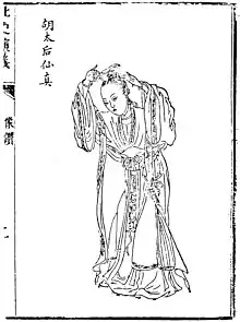 Empress Dowager Hu (Chinese: 胡太后, personal name unknown) (490s? - 17 May 528[1]), formally Empress Ling (靈皇后), was an empress dowager of the Xianbei-led Chinese Northern Wei dynasty (515-528).[2] She was a concubine of Emperor Xuanwu, and she became regent and empress dowager after her son Emperor Xiaoming became emperor after Emperor Xuanwu's death in 515. She was considered to be intelligent but overly lenient, and during her regency (interrupted by a period (520-525) where her overly trusted brother-in-law Yuan Cha seized power), many agrarian rebellions occurred while corruption raged among imperial officials. In 528, she was believed to have poisoned her son Emperor Xiaoming after he tried to have her lover Zheng Yan (鄭儼) executed. This caused the general Erzhu Rong to attack and capture the capital Luoyang. Erzhu threw her into the Yellow River to drown.