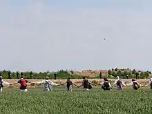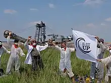 The youth climate movement Fridays for Future Deutschland (FFFD) called for an international protest event for climate protection in Aachen on the 21 June 2019, which drew 40000 people from 17 countries.[9] It was assumed that participants in the Fridays for Future demonstration would also participate in actions of Ende Gelände.[10] In advance, the police had warned of an instrumentalization of Fridays for Future by Ende Gelände 2019, which was seen by many as a "deliberate attempt to divide the movement," but instead it led to public statements of solidarization of Fridays for Future with Ende Gelände,[11][12] stating that civil disobedience was a legitimate form of protest to save the future, but, in the demonstration on 22 June 2019 in Hochneukirch/Jüchen in the direct neighbourhood of the open-pit mine,[13] that Fridays for Future would remain on the legal side.[14][15][12]