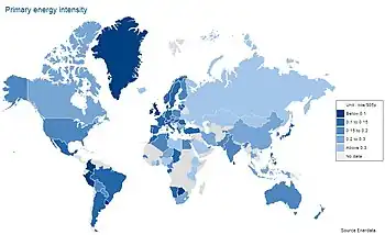 The following table displays the energy intensity in the world by koe/$05p (Kilogram oil equivalent per USD at constant exchange rate, price and purchasing power parities of the year 2005[1]), by region and by country. The energy intensity are published by Enerdata[2] and they are also available in the energy review for 2011.[3]