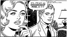 Engagement Ring is a 1961 pop art painting by Roy Lichtenstein. The work is based on the Winnie Winkle series, but Lichtenstein changed both the graphical description and the narrative accompaniment that he presents in a speech balloon.[1] As with most of his early romance comics works, this consisted of "a boy and a girl connected by romantic dialogue and action".[2]