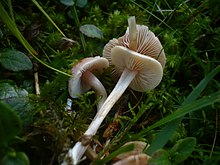 The cap measures 1 to 5 cm (0.4–2 in) in diameter, and is convex or umbonate (having a central rounded elevation resembling a nipple). It is bluish-purple when young before reddening to a reddish-purple and eventually fading to a more purplish-grey colour. The cap surface texture is initially fibrillose (made of loose fibers) to velutinous (made of short, fine "hairs" that form a velvety surface), and then breaks up into small radially arranged fibrillose squamules (small scales) as it matures. The cap margin curves downward. Gills are closely crowded together, up to 6 mm broad, and have an adnate attachment to the stipe. They are white initially before becoming tinged with pink from the developing spores. The thin cylindrical stipe measures 3–7.5 cm (1.2–3.0 in) long and 0.2–0.6 cm (0.1–0.2 in) wide with a slightly thicker base. It is dry and brittle, hollow, and white or nearly white. The flesh is purple in the cap, and white in the stipe. The smell and taste are indistinct, although the latter has been described as peppery or radish-like.[3] Its edibility is unknown.[2]