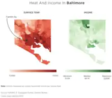 A study involving 108 urban areas found that neighborhoods with a history of redlining were five to twelve degrees hotter than neighborhoods without redlining.[59] This increase in temperature is caused by the urban heat island, an area which has a slightly warmer climate than the surrounding area. Low income communities are acutely at risk to heat mortality because of reduced access to air conditioning as well as tree cover.[60] "Temperatures on a scorching summer day can vary as much as 20 degrees across different parts of the same city, with poor or minority neighborhoods often bearing the brunt of that heat".[61]