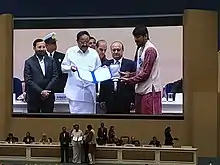![]() Ere Gowda receiving the award for Best Educational Film in the non fiction category for his film Sarala Virala from the Vice President Venkaiah Naidu in 2018 | |