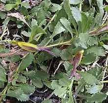 Eremophila biserrata is a prostrate shrub often with long unbranched snake-like stems up to 1 m (3 ft) long and under ideal conditions the plant may spread to a diameter of 4 to 5 m (10 to 20 ft). Its leaves are arranged alternately or clustered in rosettes, mostly 18–24 mm (0.7–0.9 in) long, 5–11 mm (0.2–0.4 in) wide, broadly lance-shaped with the narrower end towards the base. The leaves have serrated edges, the serrations often themselves serrated, sometimes deeply so that the leaf appears to have separate leaflets.[2][3][4]