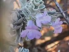 This eremophila features soft grey foliage and showy flowers but is frost sensitive and will not tolerate humidity. It has been propagated by grafting onto Myoporum and grown in well-drained soil in a sunny position.[8]