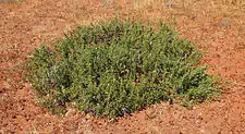 Eremophila macdonnellii is a rounded shrub with many tangled branches and which usually grows to about 0.3–1.2 m (1–4 ft) high and 0.2–1.5 m (0.7–5 ft) wide. Its branches are covered with hairs, some of which may be as long as 3 mm (0.1 in). The leaves are arranged alternately along the branches and vary in shape from linear to egg-shaped and are sometimes sickle-shaped. They are mostly 9–27 mm (0.4–1 in) long, 2–5.5 mm (0.08–0.2 in) wide, and are almost glabrous to densely hairy, sometimes with long hairs as on the branches.[2][3][4]