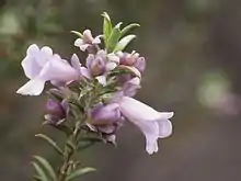 The flowers are borne singly or in pairs in leaf axils on a glabrous, sticky stalk 3–5 mm (0.1–0.2 in) long. There are 5 overlapping, cream to purple, lance-shaped sepals which are 6–11 mm (0.2–0.4 in) long and mostly glabrous. The petals are 10–20 mm (0.4–0.8 in) long and are joined at their lower end to form a tube. The petal tube is white to lilac-coloured, sometimes pink, blue or purple, and white inside with yellow-brown spots. The petal tube and lobes are glabrous apart from the inside of the lower petal lobe and the inside of the tube which have long, soft hairs. The 4 stamens are fully enclosed in the petal tube. Flowering occurs from July to October, sometimes to December and the fruits which follow are dry, oval-shaped and 3–4 mm (0.1–0.2 in) long.[2][3][4]