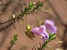 This eremophila bears many pale pink to deep lilac flowers over an extended period and attracts butterflies and other insects. It can be propagated from cuttings but grafting onto Myoporum rootstock is easier. Well-drained soils are preferred but the shrub will grow in full sun or partial shade and is very drought tolerant. It is sensitive to frosts and severe frost may kill the plant.[9]