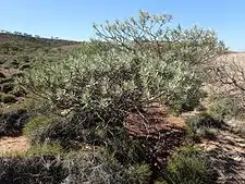 Eremophila rigens is a shrub or small tree, often with a single main stem, which grows to a height of between 1.5 and 3.5 m (5 and 10 ft). The branches and leaves are covered with a dense layer of fine white hairs when young but soon become glabrous. The leaves are arranged alternately and are densely clustered near the ends of the branches, linear in shape and tapering towards both ends. They are mostly 51–89 mm (2–4 in) long, 3–5 mm (0.1–0.2 in) wide, end in a sharp point and have a distinct mid-vein on the lower surface.[2][3]