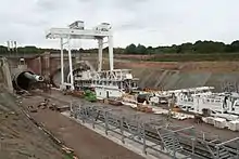 The Finne Tunnel was structurally complete in the spring of 2012. The earthworks of the 30 km (19 mi) long section in the Thuringian basin was completed in June 2012. The construction site was connected via a construction track to the Erfurt node, so that the installation of the slab track, the catenary, the electrical engineering and the train control and protection systems could be started in this section.[75] The Saale-Elster Viaduct and Osterberg Tunnel were completed by 2012.