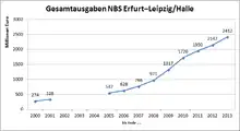 Around 1992, the planned costs of option 1 were estimated at DM 4.4 billion.[42] Early in 1993, the cost of the 194 km comprehensive overall project, which at that time also included the Bitterfeld–Leipzig and Bitterfeld–Halle sections, was stated to be D-Mark 5.54 billion. The targeted ICE traveling time between Leipzig and Erfurt was stated to be 39 minutes. Construction was planned to start in 1994, with the commencement of operations in 1999/2000.[36] When construction started in 1994, the commissioning was still foreseen in 2000, at a total cost of DM 4.5 billion as estimated in January 1994.[41] In mid-1994, the planned investment was estimated at DM 4.592 billion (gross). Contracts for building the line would be awarded in eleven lots.[18]
