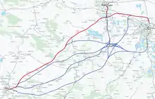 - Option 3 foresaw a southern course in the Großkorbetha area. A branch would run from there, parallel with the autobahn, to the airport. In addition, there would be an upgrade of the existing line towards Merseburg and Halle.[37] The 123 km (76 mi)-long route was calculated to cost DM 6.6 billion.[18]