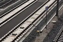 In January 2009, Deutsche Bahn called construction tenders for the subgrade of the ballastless section 2 (track-km 197.889 to km 215.937) and the ballastless section 3 (km 215.937 to km 228.685). Both contracts were to run from June 2009 to the end of April 2012.[50][51] At the end of May 2009, this was followed by the invitation to tender for the contract for the ballastless section 4 (km 251.1 to km 272.1) as well as the ballastless section 5 including the Gröbers junction (km 279.9 bis km 286.9). These contracts were to run from November 2009 to November 2012 (lot 4) and from July 2010 to December 2015 (lot 5).[52][53][54] In July 2009, finally, the integration of the line into the Erfurt junction was tendered, which would be built between December 2009 and December 2010.[55] In July 2011, a contract worth €200 million was awarded for the production of slab track and for 22 kilometres (14 mi) of noise and wind barriers between Erfurt and Gröbers. This work would be completed by the end of 2013.