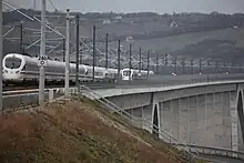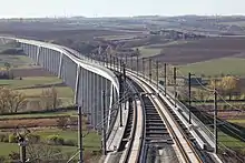 The design speed is largely 300 km/h (190 mph), reduced to 160 km/h (99 mph) on the branch to Halle.[8] 15.4 km (9.6 mi) of the 123 km (76 mi)-long high-speed line is located in three tunnels; the six viaducts of the route together are more than 14.4 km (8.9 mi) long.[9] With a length of approximately 6,465 metres (21,211 ft), the Saale-Elster Viaduct is the longest bridge structure in Germany and the longest bridge on a long-distance railway in Europe. The Unstrut Viaduct at 2,668 m (8,753 ft) is the second longest railway bridge in Germany.